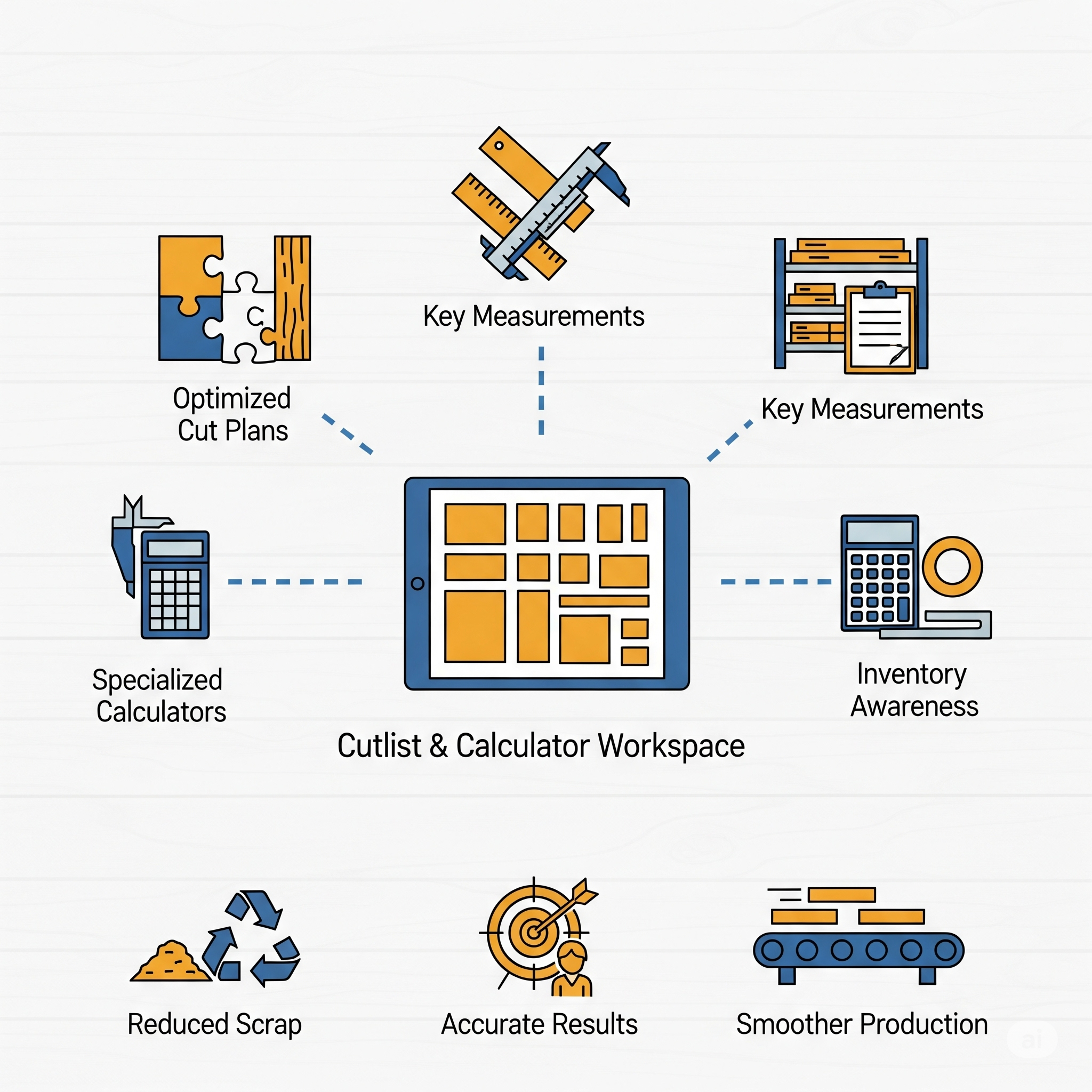 Cutting mistakes cost time and money — but so do complicated spreadsheets and manual math. The Cutlists & Calculators workspace gives woodshops precise, production-ready tools…